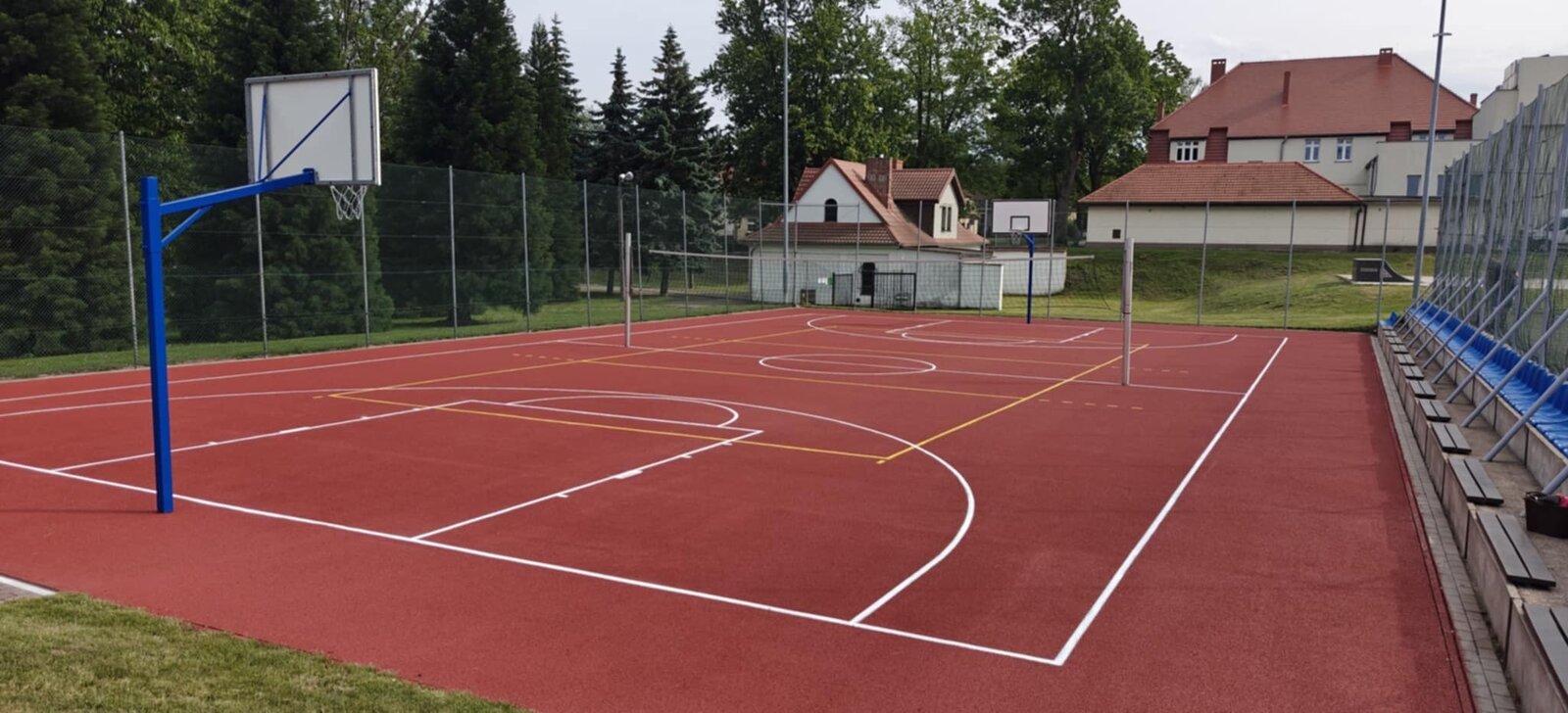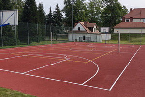 - boisko wielofunkcyjne o wymiarach 20 m × 30 m ze sztuczną nawierzchnią przygotowane do gry w piłkę ręczną, koszykówkę i siatkówkę